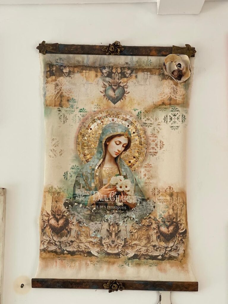 Este manto urbano de 70 cm de largo está realizado con láminas termotransferibles y láminas de seda, enriquecido con delicadas técnicas textiles que aportan textura, color y relieve. La imagen central, trabajada con detalles que evocan un estilo vintage y espiritual, convierte a esta obra en un elemento decorativo lleno de simbolismo y belleza.