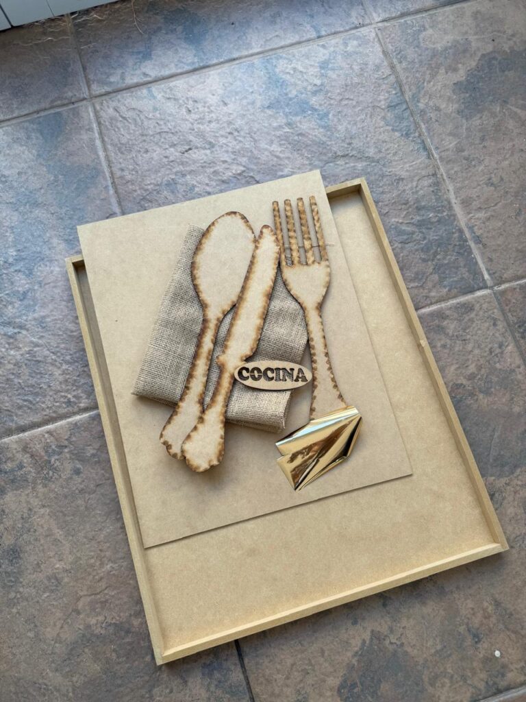 INCLUYE BASTIDOR DE 60X50CM PLACA 40X50 CM PAÑO DE ARPILLERA DE 43 X 53 CM KIT DE CUBIERTOS. TENEDOR, CUCHILLO,Y CUCHARA CARTEL COCINA Y FOIL TAMAÑO DEL CARTELITO