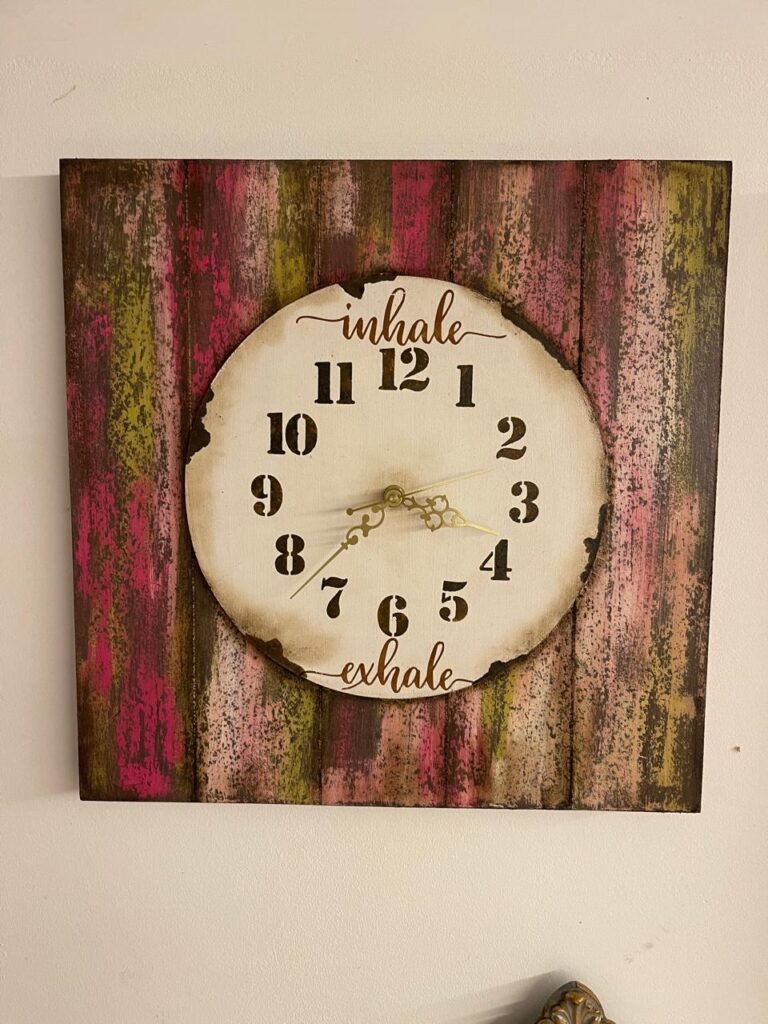 Este proyecto propone mucho mas que aprender técnicas: invita a habilitar el tiempo creativo desde la concentración y el disfrute. En este trabajo transformamos un bastidor en un reloj único, combinando técnicas mixtas como falso machimbre,  decapado, simil oxido y ensamblado del mecanismo del reloj.