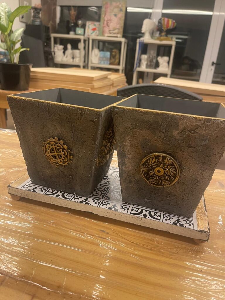 Este proyecto combina técnica creatividad y sensibilidad en una pieza decorativa única: un centro de mesa con efecto piedra, trabajado artesanalmente con textura lograda a partir de la utilización de esténciles y pasta de modelar y embellecido con apliques modelados en cerámica fría. El resultado es una superficie que imita la piedra natural, con relieves suaves y detalles que dialogan entre lo orgánico y lo decorativo. Los apliques de cerámica otorgan u toque artístico y personalizado, haciendo de cada pieza un objeto con identidad propio.