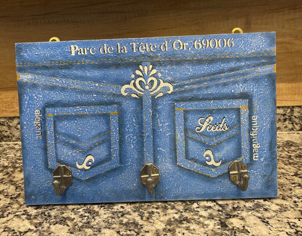 Este perchero imitación jeans es una pieza artesanal que combina funcionalidad con diseño artístico. realizado sobre mdf y trabajado con técnicas de pintura decorativa, simula un pantalón con bolsillos, costuras en tonos mostaza y detalles en esténcil que evocan un aire parisino.